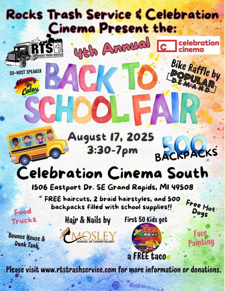 Join Rocks Trash Service and Celebration Cinema for their 4th Annual Back to School Fair on Sunday, August 17th from 3:30pm-7pm at Celebration Cinema South!
