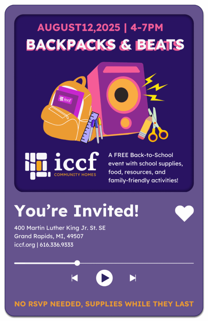 Join us at the Backpacks and Beats back-to-school event featuring a school supplies giveaway on Tuesday, August 12th from 4pm-7pm at ICCF!