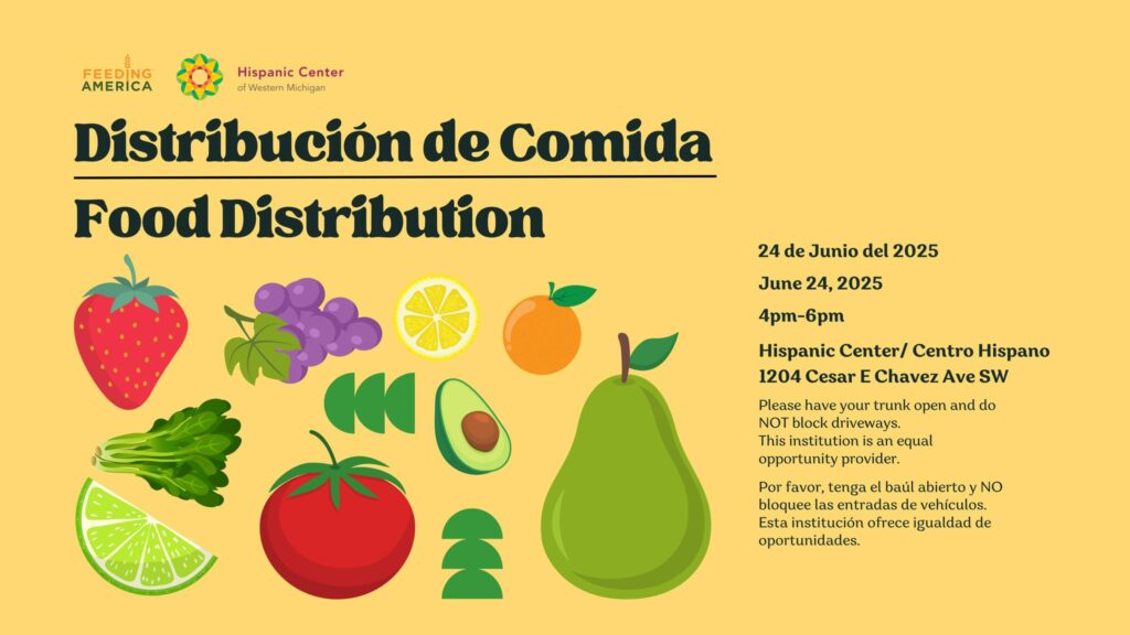 Attend the food distribution event held by the Hispanic Center of Western Michigan on Tuesday, June 24th from 4pm-6pm.