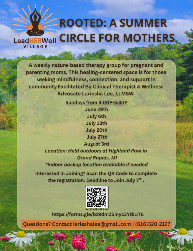 Join Rooted: A Summer Circle for Mothers, a six-week therapy group for pregnant and parenting moms hosted by LeadHERWell Village and facilitated by Lariesha Lee, LLMSW.