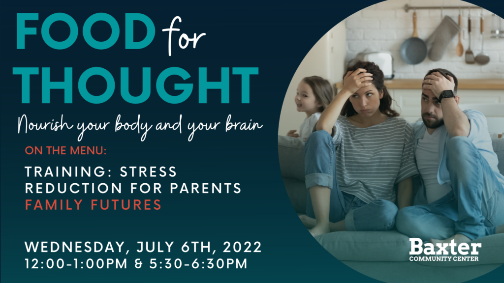 Parenting is hard – we want to help you through it! Our team member Dr. Sandy Portko will be leading a training on stress reduction for parents through Baxter Community Center’s “Food for Thought” event series. Lunch is provided at the 12:30 session and dinner is provided at the 5:30 session.