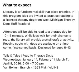 Reading doesn’t have to be ruff, bring your kids and let them read to licensed therapy dogs!