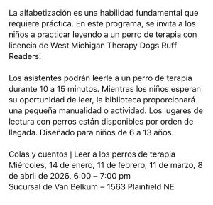 Attendees will be able to read to a therapy dog for 10-15 minutes. While kids wait for their chance to read, the library will provide a small craft or activity.
