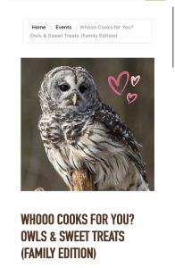 Register here: https://blandfordnaturecenter.doubleknot.com/event/whooo-cooks-for-you-owls-and-sweet-treats-family-edition/3126315
